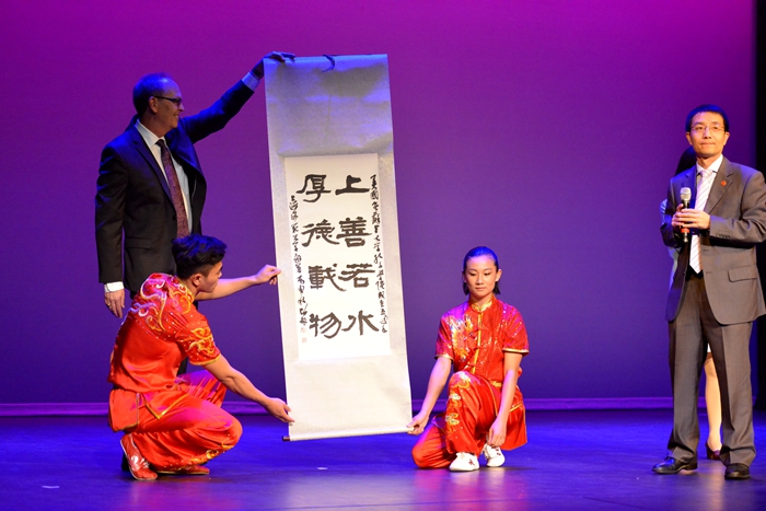 葛卫华代表学校对孔子学院成立五周年表示祝贺。他表示,密苏里大学孔子学院成立至今,开展了多种文化交流活动,并推动中文教学走进中小学课堂,让越来越多的美国民众更好地学习中文、了解中国。孔子学院成为了名副其实的促进中美合作交流的文化桥梁。作为中方合作单位,上海师范大学将一如既往地支持孔子学院健康、可持续的发展,期待孔子学院下一个五年更加辉煌。葛卫华代表学校向密苏里大学赠送了由我校美术学院张信教授书写的书法作品“上善若水,厚德载物”。寓意传承中华传统文化,孔子精神缔结中美友谊。