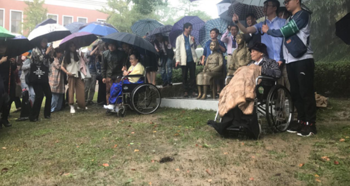 10月22日,上海师范大学中国“慰安妇”历史博物馆开馆典礼现场,幸存者李容洙和陈连村在两座慰安妇雕像前。 澎湃新闻记者 杨宝宝 图