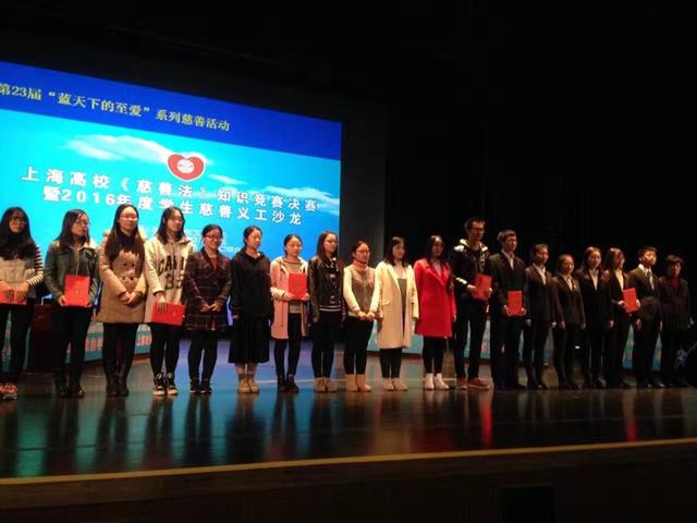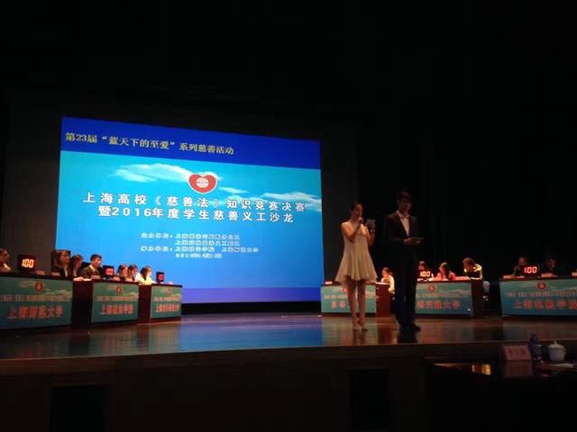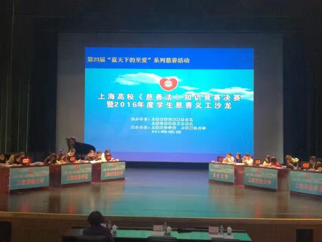 12月18日,上海高校《慈善法》知识竞赛决赛暨2016年度高校学生慈善义工沙龙在上海政法学院学生礼堂举行。上海交通大学、上海师范大学、东华大学、上海对外经贸大学、上海电机学学院和上海政法学院等六支慈善义工队派出选手参加了决赛。经过激烈竞争,上海交通大学获得一等奖,上海电机学院、上海政法学院获得二等奖,东华大学、上海对外经贸大学和上海师范大学获得三等奖。