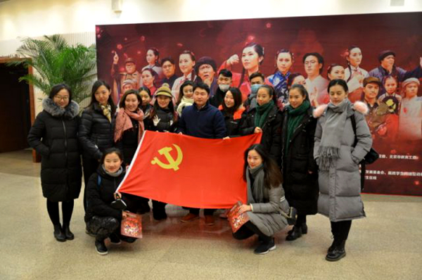 中国戏曲学院的同学们在观演后激动地拿出党旗合影