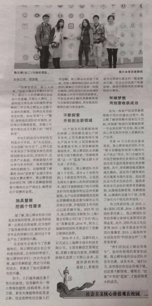 东方教育时报:创业从“坐看苍苔色”起——上师大生态学专业研究生陈云辉“以小见大”探索苔藓微景观新领域