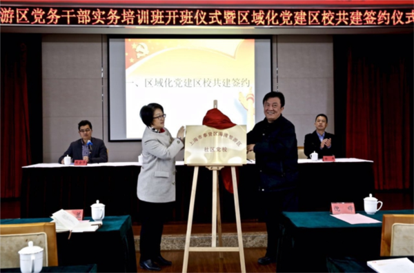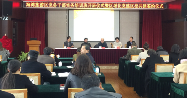 签约仪式后,区域化党建区校合作的第一个合作项目“海湾旅游区党务干部实务培训班”开班了。此次培训班为期三天。作为培训班的主要组织者,马克思主义学院精心设计了培训班大部分课程内容,包括《全国两会精神解读》、《党建引领下的社区自治、共治探索》、《怎样当好一名支部书记?》等七大专题,由学院党建工作品牌马克思主义理论宣讲团承担此项工作,精心组织了全国教学名师博士生导师汪青松教授和中青年教师骨干、党支部书记等师资力量,学院的研究生党员也将在此次培训班就十八大以来新修订的《中国共产党章程》进行解读。