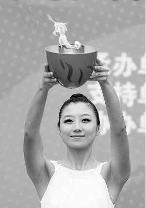 ■ 昨天,杨蝉在展示亚运圣火罐 新华社记者 王毓国 摄