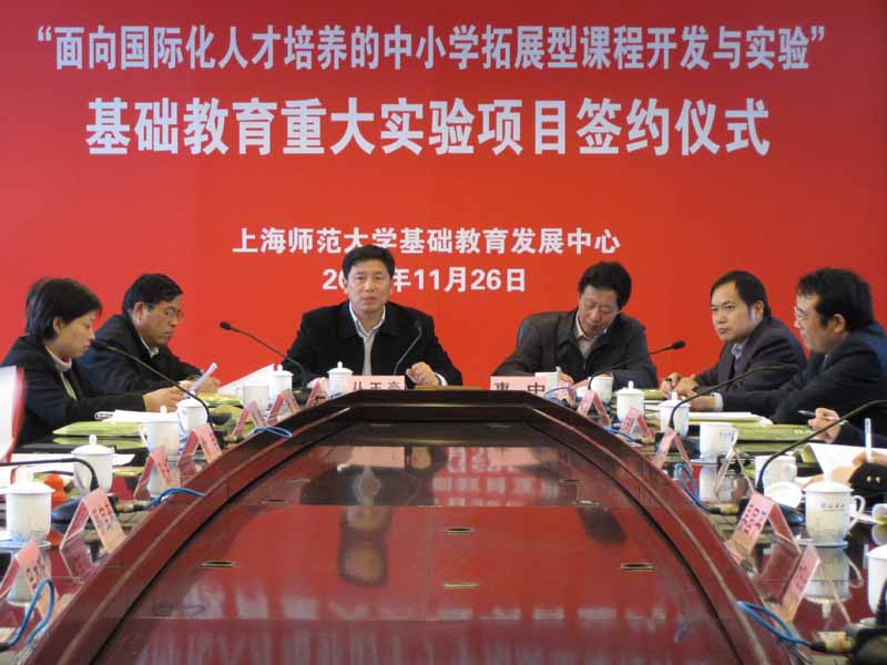 11月26日下午,上海师范大学基础教育重大实验项目“面向国际化人才培养的中小学拓展型课程开发与实验”的签约仪式在外宾楼举行。副校长丛玉豪、社科处处长陈昌来、基础教育发展中心主任惠中,上海市实验学校等8所参与本项目的附属中小学校的校长,以及6位教育专家参加了本次签约仪式。
