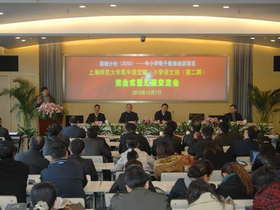 12月7日,“国培计划(2010)——中小学骨干教师培训项目”上海师范大学高中语文班、小学语文班(第二期)结业式暨汇报交流会在我校会议中心隆重举行。教育部师范教育司副司长宋永刚、校长李进、教育学院负责人以及研修班首席专家王荣生教授、小学语文研修班首席专家吴忠豪教授出席会议。来自全国各地的41名高中语文教师和45名小学语文教师参加了会议。