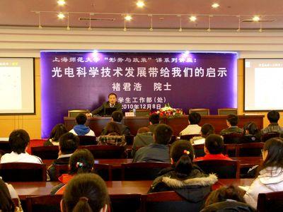 12月8日下午,学工部邀请我国半导体物理和器件专家、中科院院士、我校校友褚君浩在奉贤校区为学生开展了“形势与政策”课系列讲座之二——《光电科学技术发展带给我们的启示》。