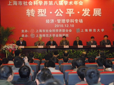 上海市社会科学界第八届(2010年度)学术年会“经济•管理学科”专场于12月10日在我校隆重举行。本次专场由上海市社会科学界联合会和我校联合举办、金融学院承办,会议收到论文330篇,入选优秀论文87篇,共有来自本市政府部门、高校及研究机构的约250位专家、学者参加了讨论本次年会。