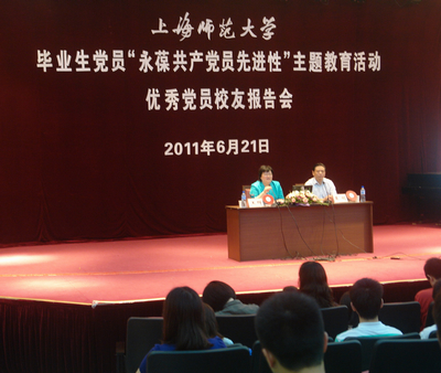 6月21日上午,我校党员校友上海中医药大学党委副书记王群,结合自身成长经历在“东方讲坛”上为300多名毕业生党员作了题为“感动•感恩•感悟——与青年党员谈理想信念”的报告,校党委副书记黄刚主持,组织部部长盛春出席。