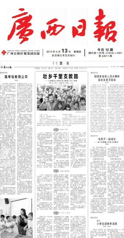自2007年以来,我校研究生支教团志愿服务广西百色田阳山区基础教育,支教团员的出色表现不仅获得了广西壮族自治区教育厅、共青团广西壮族自治区委员会的肯定,也引发了当地媒体的报道。近日,《广西日报》在教育版头条刊发了关于我校研究生支教团服务广西百色地区的长篇通讯。现摘录如下: