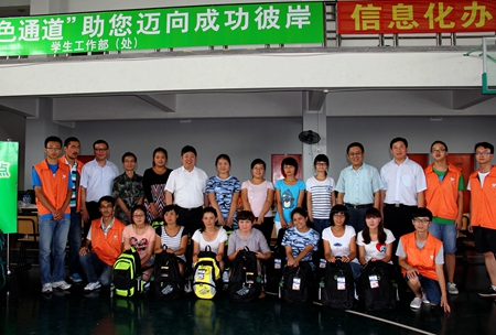 学工部在体育馆设立新生“绿色通道”服务点,校党委书记陆建非、校长张民选等领导来到现场,为受助学生发放爱心大礼包,真正履行了“不让任何一个新生因为经济困难而辍学”的承诺。“红苹果慈善义工队”队员主动担任新生接待志愿者,协助学工部工作人员引导新生办理相关手续,特别是来自新疆和西藏的少数民族义工队员,他们热情地为新疆和西藏新生介绍资助项目,引导办理各项手续,拉近了彼此的距离,让新生们倍感亲切。