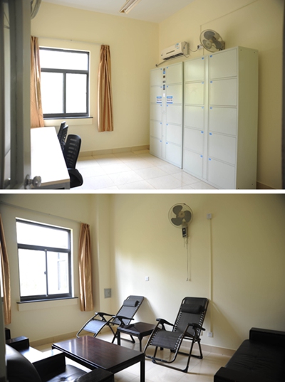 五、改建教师休息室。今年在奉贤校区二、三、四、五教学楼总共改建了15个教师休息室,新增方便教师休息的躺椅、方便上网和备课的办公桌、安装了空调、电话、电子寄包柜等设施,提供了服务指南。教师休息室实行了男女分开,并建立了门禁管理系统,教师刷工作证就可进入休息。