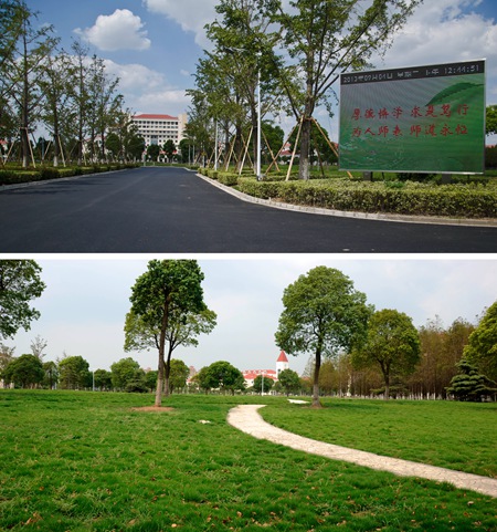 六、南区道路翻修和部分草坪更换。完成南门进校主干道2700多平方米破损道路翻修、南大门闸机整修解决了车辆进校时因道路不平颠簸的问题。通过更换南区东南侧约4000平方米的旧草坪,解决了该区域杂草较多、小路雨天积水等问题。