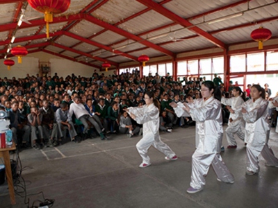 在Kgolagano中学,五百多名学生一起观看了中国教师们的精彩表演,在随后的互动环节,学生们更是积极参与每项活动,其热情让老师们几乎招架不住。Ngwatle小学是本次七所学校中最偏远的一所,仅有76名学生,孔院教师们克服长途跋涉的辛苦,全力演出,学生们更是用最热烈的掌声来答谢老师们的精彩表演,在中国老师离开的时候,他们追赶着车辆,久久不愿离去,不断用刚刚学到的汉语跟老师们说“再见”。在TSHOMOLOGO中学,一百多名学生一起顶着烈日在室外学习中国武术,仅仅半个多小时,就将一套简单套路打得像模像样,展示出良好的领悟力,该校校长Basime女士还特意让中国老师将校名用汉字写出来,悬挂在办公室,来纪念这次活动。在中国政府援建的Dinokwane小学,师生们第一次近距离接触原汁原味的中国文化,每个人都激动不已,每个人都想有一个汉语名字,让孔院老师用毛笔写下并收藏起来。