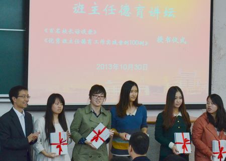 会上,葛卫华向师范生代表赠送了《百名校长访谈录》、《优秀班主任德育实践工作案例100例》。今年暑假,学校组织师范生寻访中小学校长和优秀班主任,并于9月编辑出版了《百名校长访谈录》、《优秀班主任德育工作实践案例100例》两本书,通过实地寻访、撰写感受,不仅传递了名师的教育理念和教学方法,更让师范生感悟名师的人生追求和职业精神。