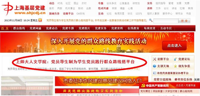 11月8日,上海基层党建网在首页头条位置,以“上师大人文学院:党员导生制为学生党员践行群众路线搭平台”为题,报道了我校人文学院开展党员导生活动的有关情况。报道内容如下: