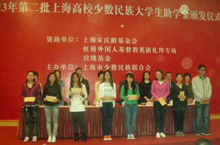 日前,在上海交通大学举行的2013年第二批上海高校少数民族大学生助学金额颁发仪式上,我校来自人文、法政、教育、旅游、生环、数理等学院的20名少数民族学生受到资助。此次共有来自本市19所高校的180名少数民族学生受到资助,获得了总计45万元助学金。