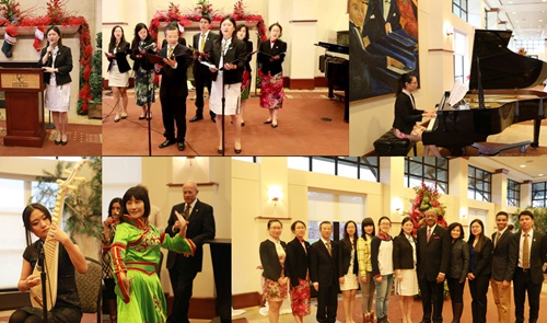 随后,孔子学院的全体教师在欧阳博士的带领下,向来宾们呈现了一台高质量的极具跨文化交流特色的文艺节目。 舞姿优美的蒙古舞“蓝色的故乡”、优雅动听的钢琴曲“梦中的婚礼”、吉庆祥和的琵琶独奏“步步高”等节目,赢得了来宾们的阵阵掌声。孔子学院全体教师用中英文献唱的“We Wish You a Merry Christmas(祝你圣诞快乐)”和“Silent night(平安夜)”更把会场的气氛推向了高潮。