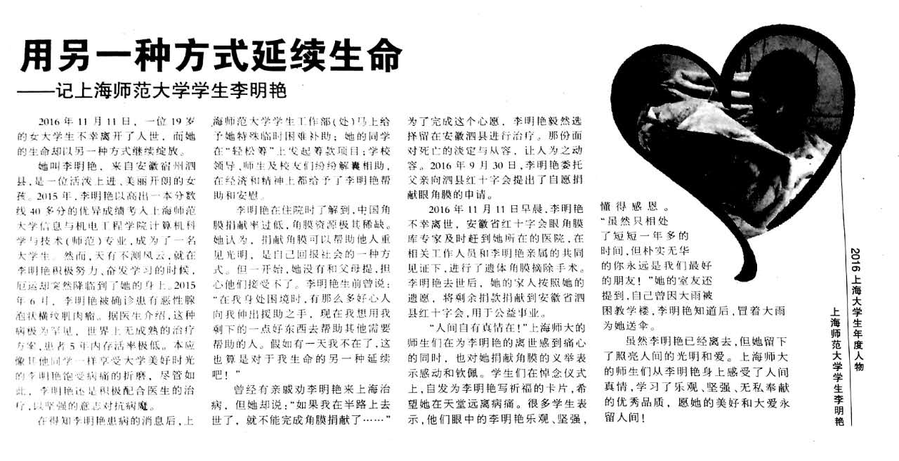 东方教育时报:用另一种方式延续生命——记上海师范大学学生李明艳