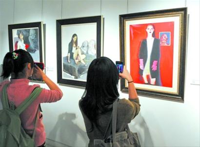 昨天,观众正在参观上海师范大学美术学院教师作品双年展。
