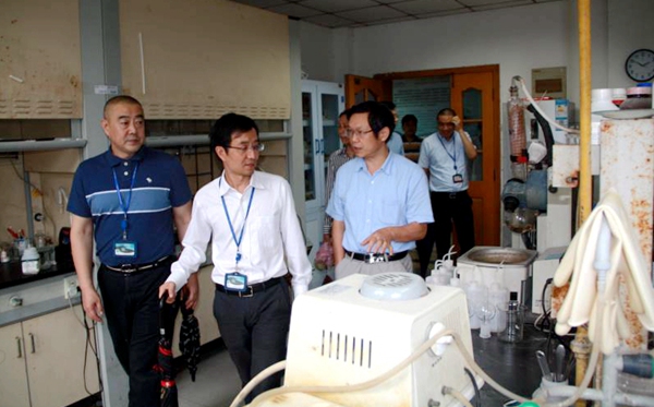 葛卫华一行先到生环学院化学楼的重点实验室进行检查。首先对楼道内堆放的废液桶和氧气瓶查看询问,叮嘱安全负责人确保安全。又到实验室对仪器的管理、化学药品存放柜、电器设备的安全用电等方面,亲切询问学生使用情况,嘱咐学生假期期间仍需注意实验安全。