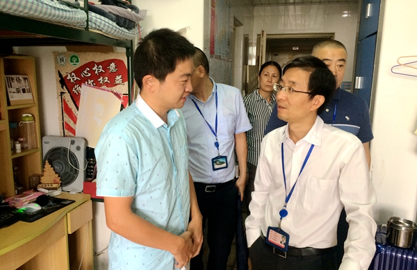 在西七、西十学生宿舍楼进行安全检查时,葛卫华关切询问学生国庆假期是否回家,交代学生离开寝室关电源、防范火灾盗窃,特别对新生还询问是否适应,假期外出注意人身安全。