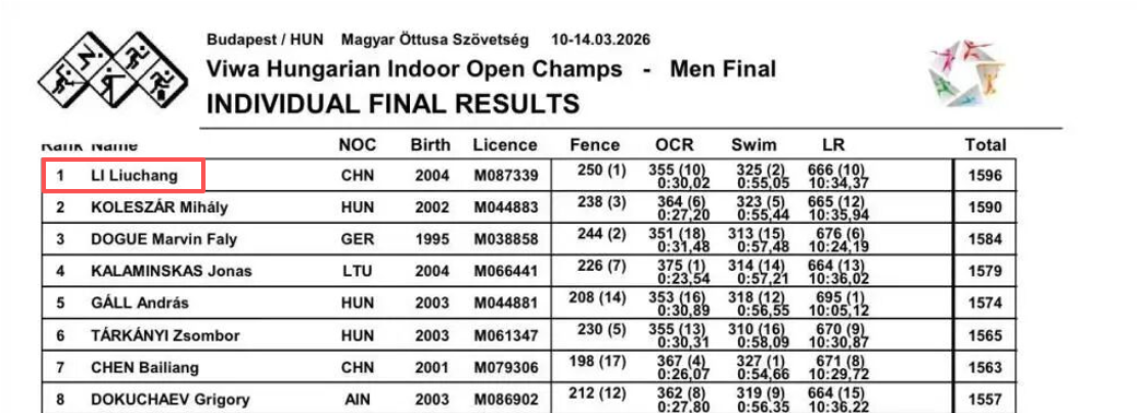 世界现代五项室内锦标赛是由国际现代五项联盟(UIPM)主办的全球最高水平室内赛事之一,每年举办一届。比赛设置击剑、游泳、激光跑(射击+跑步)、障碍等项目,对运动员的爆发力、技术稳定性及心理素质提出极高要求,是各国检验冬训成果、发掘潜力新星的重要舞台。本届赛事汇聚了欧洲、美洲多位顶尖高手,李刘畅在击剑和游泳项目中表现尤为突出,分别获得单项第一名和第二名,最终以稳定全面的发挥强势登顶,充分展现了中国现代五项年轻一代的成长与突破。