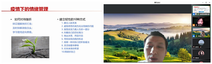 同时担任上海高校心理咨询协会常务副理事长,中国心理卫生协会大学生心理咨询专业委员会常务委员、副秘书长,中国心理学会注册督导师的刘教授具有丰富的理论知识和实践经验。他为大家梳理了此次疫情防控形势,解读了中央相关政策,从心理学“应激与应激反应”的理论角度分析了师生容易出现的身体和心理状况,引导辅导员老师们认识和接纳不良情绪状态,他建议,可以从保持社会联系、运用积极心态、管理情绪、积极思考和恢复良好生活节奏等方面来维护心身平衡。
