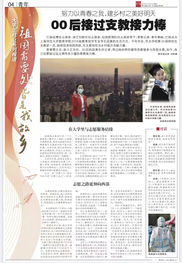 2021年是建党百年。那年7月1日,段爽拥有了一个新的身份,她作为上海市100名新党员代表在上海市庆祝中国共产党成立一百周年晚会上进行入党宣誓。而今,在“乡村振兴、教育先行”的号召下,段爽说,自己有幸肩负一名青年党员的使命,在毕业后选择加入“中国青年志愿者扶贫接力计划”第24届研究生支教团,投身祖国西部进行乡村教育支教工作,延续属于自己的志愿之路。她将运用一名师范类院校毕业生的专业所长,展现当代青年的青春力量。