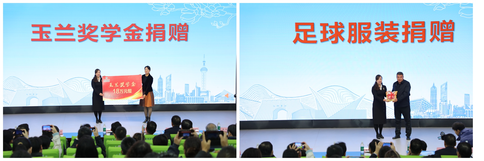 随后,现场举行了三项捐赠仪式。上海师范大学校友会、教育发展基金会秘书长陈燕代表校基金会捐赠玉兰奖学金、足球鞋与足球衣等。上海师范大学第二附属中学校长蔡文代表学校捐赠图书。多年来,上海师范大学及其附属学校始终以实际行动支持喀什教育发展,通过物资捐赠、资源帮扶等方式,为师生们创造更好的教学与学习条件。