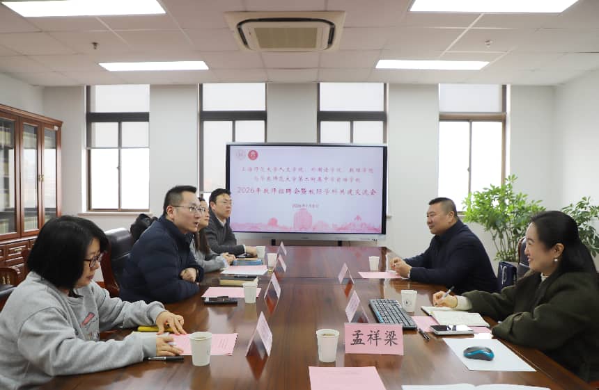 为进一步促进毕业生高质量就业,更好发挥教育资源的辐射共享作用,不断探索大中小学融合、协作、互促发展的有效举措,1月8日下午,人文学院党委书记潘黎勇,人文学院党委副书记、副院长戚静,外国语学院党委副书记、副院长臧艳雯,数理学院党委副书记、副院长林恺,人文学院就业专项负责人孟祥梁,在上海师范大学徐汇校区文苑楼与前来走访交流的华东师范大学第二附属中学前滩学校党委书记兼常务副校长李环宇,校务办公室主任刘莉莉,共同开展校际学科共建洽谈和教师招聘交流。