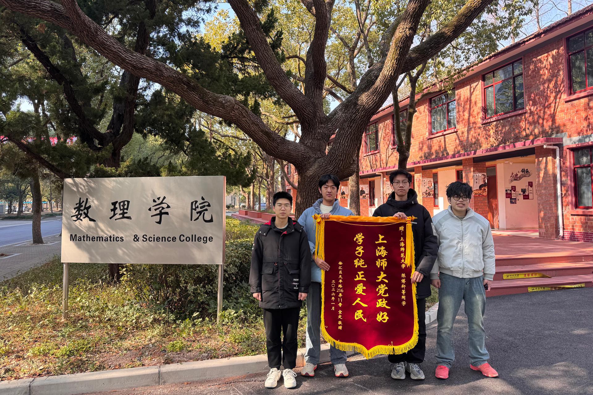 2025年的最后一天傍晚7时,淮海中路街头发生了揪心的一幕。一位八旬老人在行走途中不慎绊倒,头部触地、鲜血直流。危急时刻,我校数理学院2025级数学与应用数学(师范)专业的陈博轩、郑光廷、叶家良、李佳磊四位同学从周围迟疑和观望的人群中走上前去,毫不犹豫地将老人扶起,并迅速拨打120急救电话,为救治老人争取到了宝贵的时间。