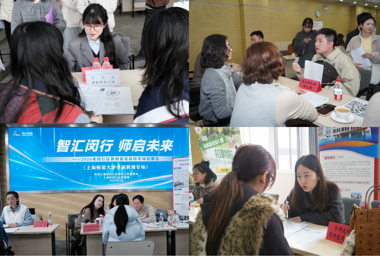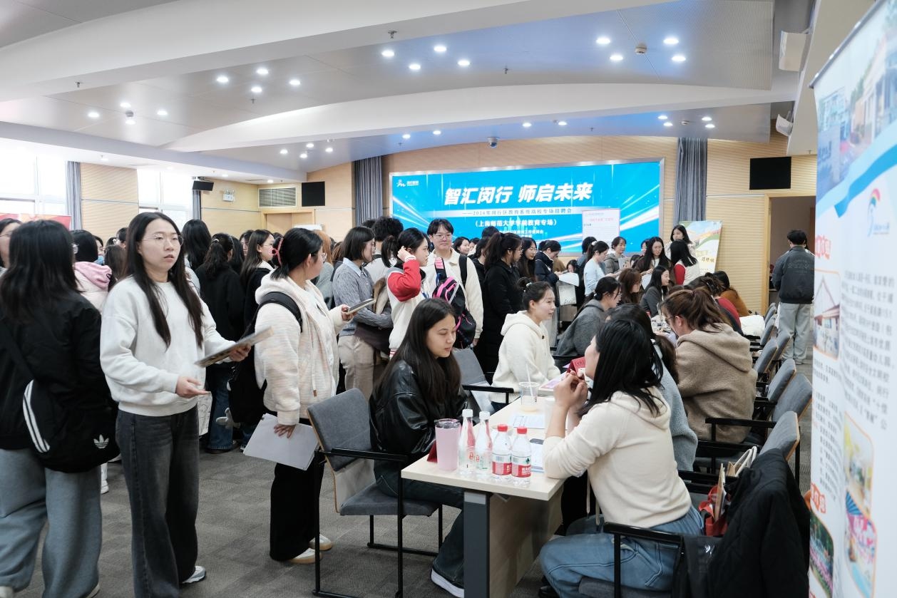 为精准对接学前教育领域人才需求,更充分、更高效地促进2026届毕业生就业,3月19日下午,闵行区教育系统高校专场招聘会(上海师范大学学前教育专场)在徐汇校区西部会议中心2号报告厅举行。本次活动由闵行区教育局主办,学前教育学院承办,闵行区18所优质公办幼儿园携近百个岗位组团前来招聘,吸引了数百名在校生到场。