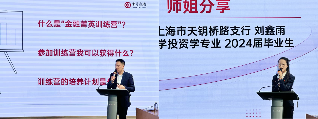宣讲会上,中国银行上海市分行人力资源部招聘与员工关系团队人力资源经理倪俊对中国银行的百年发展历程和“金融菁英训练营”的核心内容进行了介绍,重点解读训练营的意义和目的、培养方案及进度安排。随后,第一期金融班优秀学员,现就职于中国银行天钥桥路支行的刘鑫雨校友分享了自己从校园金融班走到职场中行的成长经历。自大三起,她便积极投身于金融班,在学习实践中深刻了解、认同中行文化。这段宝贵经历助力她顺利入职中国银行,也奠定了她职业发展的坚实基础。