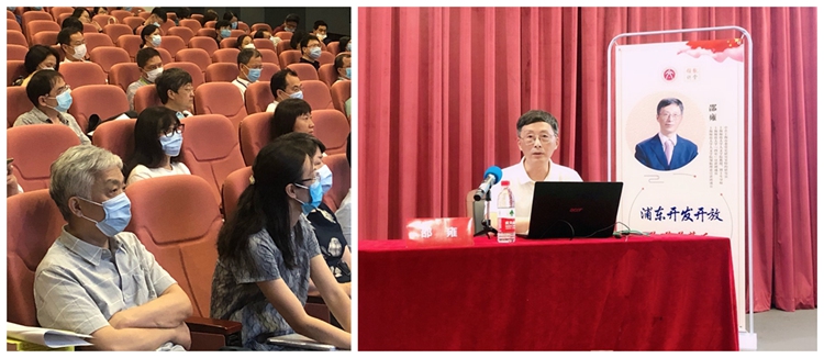 邵雍教授从新时期初期上海的困境,邓小平主导下的浦东开发开放的英明决策,几代领导人对浦东开发开放的关心与支持,党中央对浦东开发开放的指导,浦东新区成就辉煌五个方面向与会师生做了生动详实的介绍,从“原本只有一些简陋的住宅和农田的浦东”,一步步成为了“高楼林立、生机盎然的金融贸易区”,浦东成为了“上海现代化建设的缩影和中国改革开放的象征”。邵雍教授强调,历史已经证明,党中央关于浦东开发开放的决策是正确的。在党中央、国务院的坚强领导下,而立之年的浦东新区正在奋力前进,勇当新时代全国改革开放和创新发展的标杆与彰显中国理念、中国方案、中国道路的排头兵与先行者。