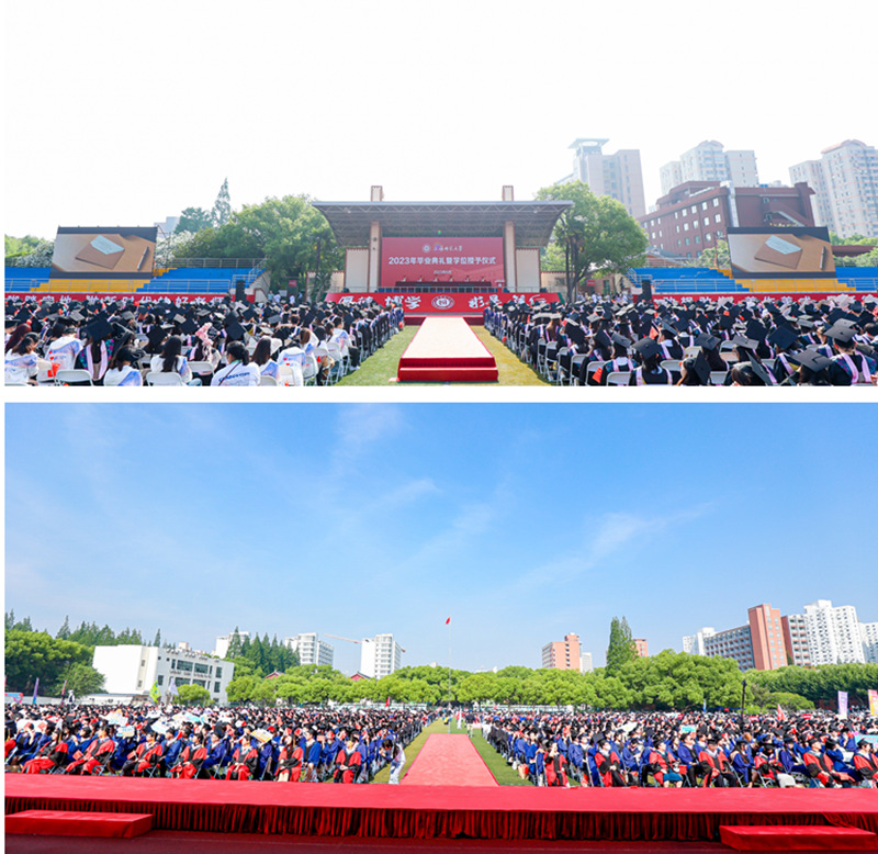 6月15日上午,“挺膺担当 逐梦远航”上海师范大学2023年毕业典礼暨学位授予仪式在徐汇校区西部大操场举行。校领导、教师代表和2023届全体毕业生参加了庄重而热烈的典礼。身处全国各地的校友和家长在线观礼,20余万人次通过直播观看毕业典礼。