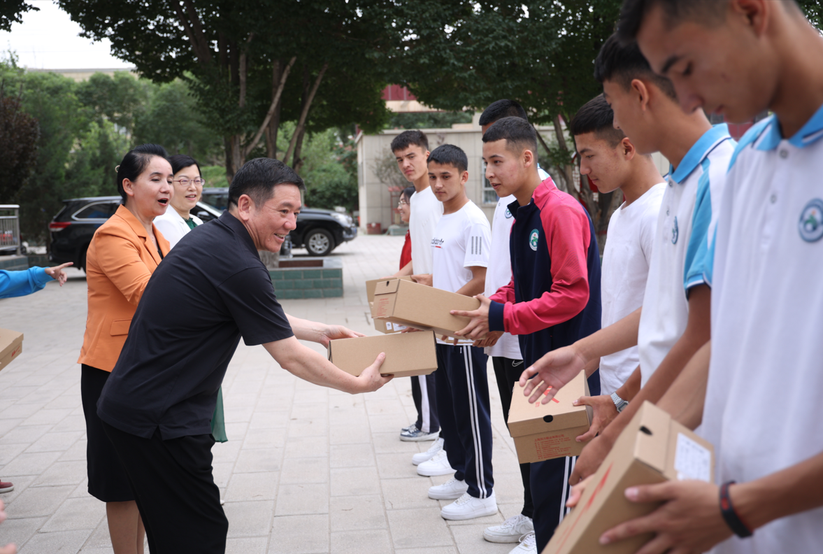 张叶江等还出席了足球运动鞋捐赠的仪式。向附属喀什中学足球队贫困学生捐赠了专业足球运动鞋,并鼓励足球队少数民族学生运动员朝着梦想努力,为校争光、为国争光。值得高兴的是,参与足球鞋捐赠仪式后随即出征新疆维吾尔自治区第七届青少年校园足球联赛(高中组)的附属喀什中学校足球队一路高歌猛进,顽强拼搏,愈战愈勇,赛出了风格,赛出了水平,最终取得新疆维吾尔自治区第七届青少年足球联赛(高中组)的决赛冠军。