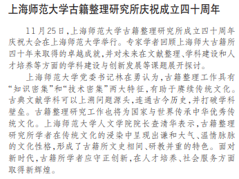 11月25日,上海师范大学古籍整理研究所成立四十周年 庆祝大会在上海师范大学举行。专家学者回顾上海师大古籍所 四十年来取得的卓越成就,并对未来在文献整理、学科建设和人才培养等方面的学科建设与创新发展等课题展开探讨。