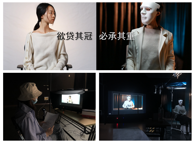 短视频广告《欲贷其冠,必承其重》是一部以校园贷为题材的作品,由2019级广播电视专业硕士研究生袁欣任导演,王敏、杨倩、郑卓、王娜等同学共同参与创作。作品采用一个演员表演、左右分屏的创意形式呈现。右屏面具人代表欲望的化身,左屏则是借贷学生本人,左右屏之间,隔屏既有区别又有互动。创作难点在于一角分饰两人,动作要求同步对应,以及通过不同灯光类型刻画相反的人物形象;表演,导演,摄影,剪辑等各方面整体技术难度较高。整个创作仅为30秒时间,但是形式感强烈,节奏张弛有度,生动形象地表现了劝诫学生远离校园贷的主题。