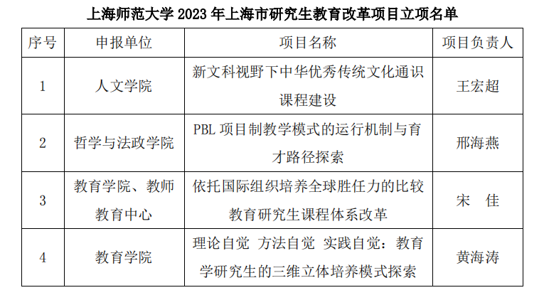 日前,上海市教委发布《上海市教育委员会 上海市学位委员会关于公布2023年上海市研究生教育改革项目立项名单的通知》(沪教委高〔2023〕48号),上海师大共有4个项目获得2023年上海市研究生教育改革项目立项,立项数量居市属高校前列。