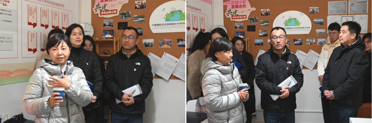 揭牌仪式后,全体领导老师与学生代表进入工作室内参观,并由党员特日格勒呼(2022级博士生)和包春玲(2023级博士生)开展主题为《加强中蒙合作,共建绿色丝绸之路》的党课宣讲。他们围绕“一带一路”倡议背景、十年丰硕成果、绿色发展和项目成果等内容,结合图文、视频和科普互动开展了精彩的宣讲。党课主题鲜明、内容丰富、形式多样,现场反响热烈。