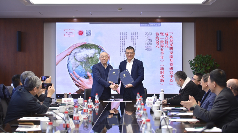 12月25日,上海师范大学“人类文明交流互鉴研究中心”(以下简称中心)在东部校区文科实验楼挂牌成立。中心由上海师范大学、上海市社会科学界联合会和世纪出版集团联合成立,旨在强化区域国别研究,以文明交流互鉴案例库建设为抓手,从共享人类文明遗产的角度凸显人类命运的整体性,并推动相关研究成果的整合、出版、宣传与传播。我校党委书记林在勇与上海市社联党组书记王为松、世纪出版集团党委副书记兼总裁阚宁辉、上海外国语大学党委书记姜锋共同为中心揭牌,副校长张峥嵘主持开幕仪式。