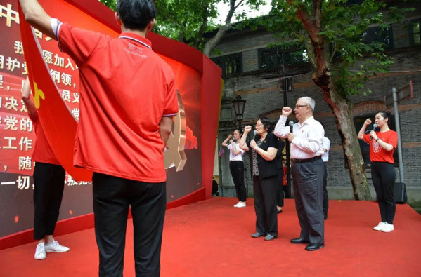 2020年6月29日,新时代答卷人——上海市教育系统庆祝中国共产党成立99周年暨学生爱国主义教育主题活动在中共一大会址纪念馆举行。图为活动现场,中国工程院院士、复旦大学教授闻玉梅,中国科学院院士、同济大学教授郑时龄带领高校师生代表重温入党誓言。