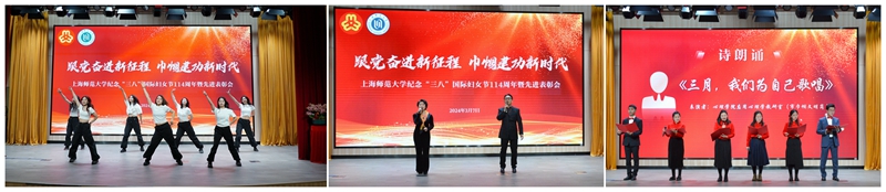 表彰会上校教职工舞蹈队表演了开场舞《Good time》;上海市教育系统比翼双飞模范佳侣提名奖获得者谈天佳、黎松涛夫妇表演了二重唱《这世界那么多人》;市巾帼文明岗获奖单位心理学院应用心理学教研室进行了诗朗诵《三月,我们为自己歌唱》。会后,校领导与获奖者合影留念。