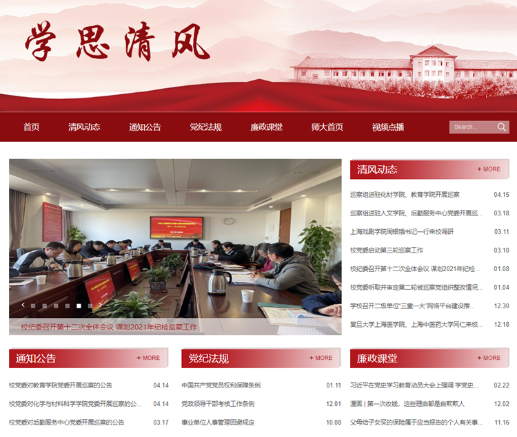 网站设有“清风动态”“通知公告”“党纪法规”“廉政课堂”“视频点播”“文化”“声音”“警钟”等多个栏目,在学校主页专题网站栏目设置入口链接。专题网站是学校坚持正风肃纪,加强监督执纪问责,紧盯重点领域、关键环节,一体推进“三不”机制建设、发挥巡察利剑作用的重要载体,也是开展党纪法规教育、弘扬廉政文化、激励干部担当作为的思想阵地。