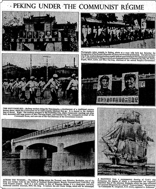 因而在新中国成立后,除了当天发布新中国成立的消息外,几乎每天都有相关报导。在4日这一天发了一组图片新闻——“共产党体制下的北京”,比较全面地反映了新中国成立时的喜庆场景。这组照片共4张,其中左上照片,悬挂着的标语“全世界无产阶级联合起来”,上方有毛泽东、列宁、马克思、恩格斯、斯大林和朱德(不过在图片说明文字中,英国人把排列的位置弄反了)的照片;右上图片是庆祝新中国成立的游行场景;左下是铁路工人扭秧歌的情景;右下是紫禁城南大门入口处,悬挂着毛泽东与朱德的巨幅照片,下有“将革命进行到底”的大字。