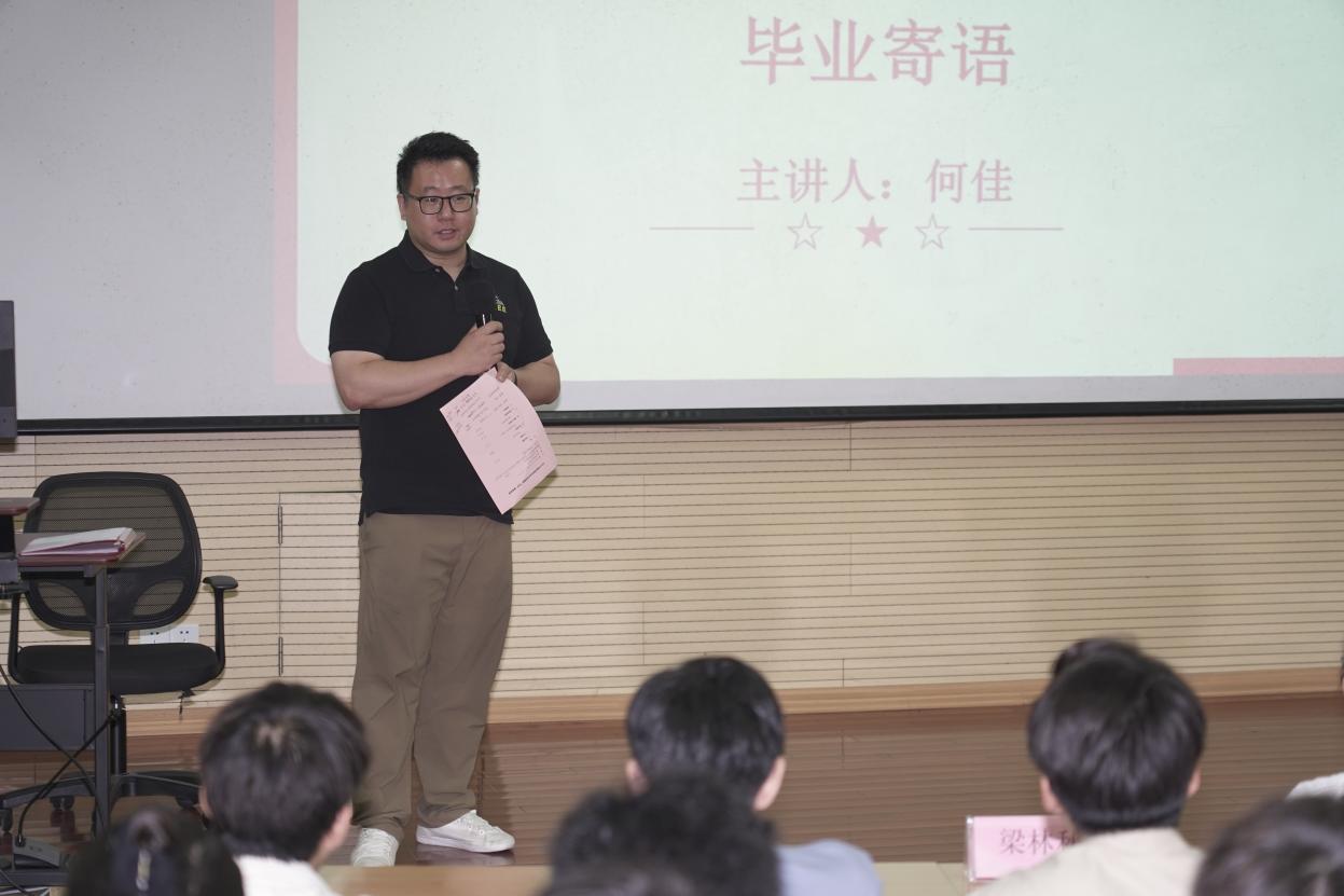 何佳代表学院党委寄语毕业生党员,提出殷切希望。他指出,毕业是一个新的起点,希望全体毕业生在未来的学习生活中,要勇于挑战、提高本领;要牢记党员身份,尽职尽责;要注重实际,全心全意为人民服务。他勉励同学们,要对生活充满希望,勇于面对困难,在人生道路上不断奋斗,把初心落在行动上、把使命担在肩膀上,用实际行动实现自身梦想。