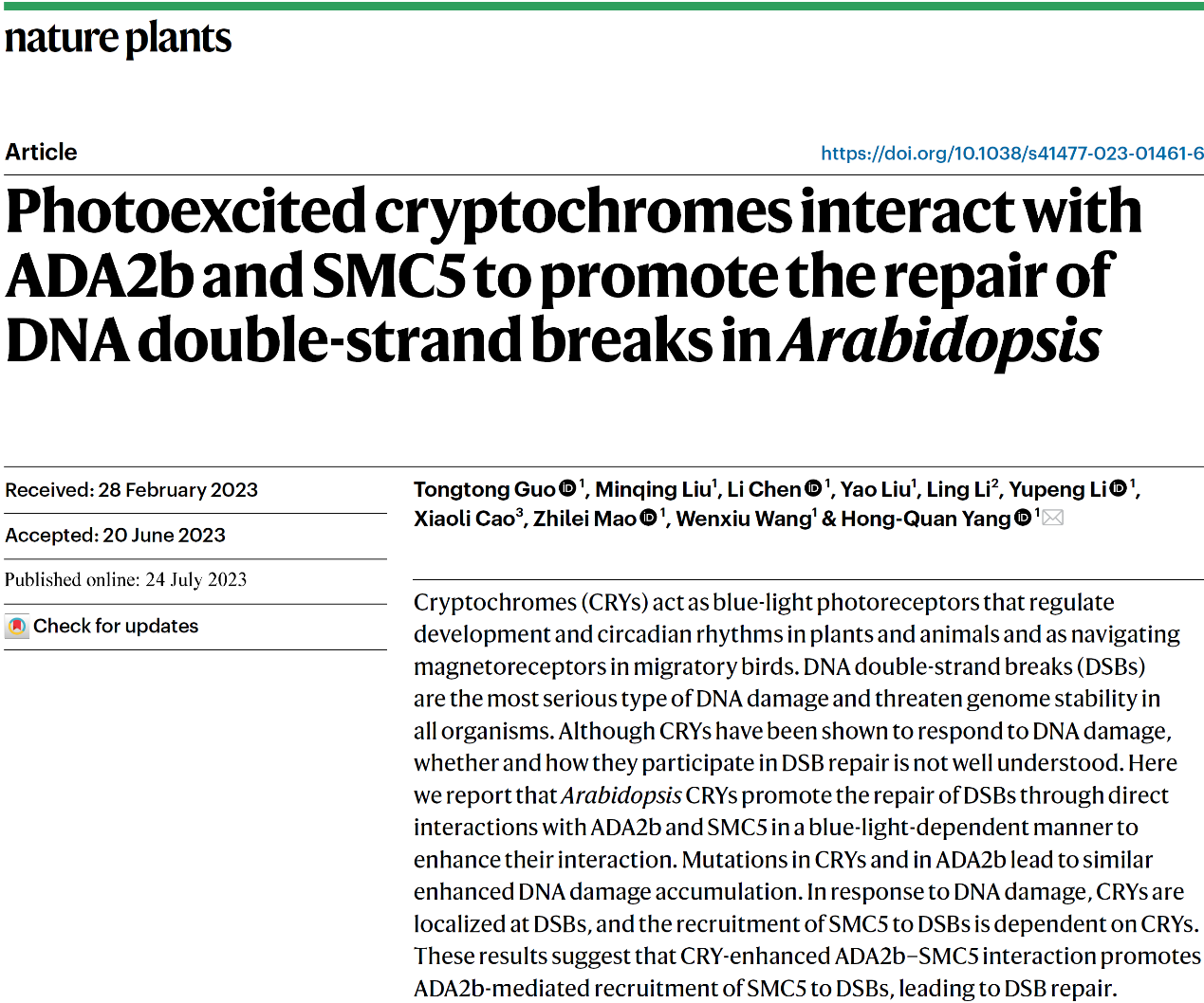 7月24日,上海师范大学杨洪全团队在Nature Plants发表了题为“Photoexcited cryptochromes interact with ADA2b and SMC5 to promote the repairof DNA double-strand breaks in Arabidopsis”的研究论文(https://www.nature.com/articles/s41477-023-01461-6),报道了拟南芥CRY促进DSB修复的功能及其分子调控机制。