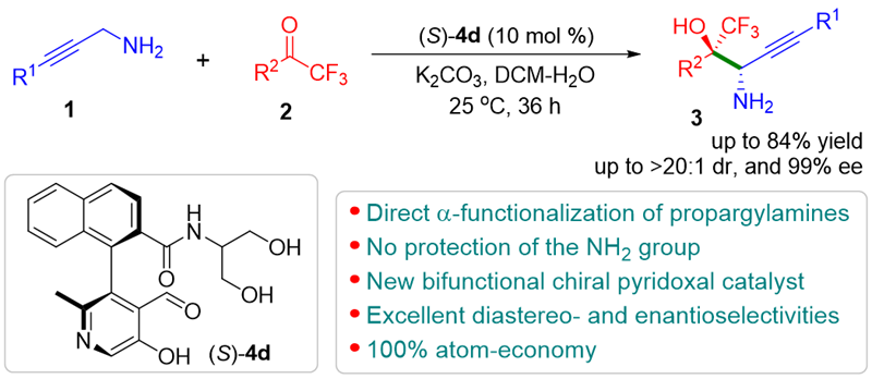 仿生催化是向大自然学习、模拟生物酶的化学催化策略,目的是综合化学催化和生物催化的优势,实现在环境友好的温和条件下,高选择性、高效率地合成目标产物。赵宝国教授与陈雯雯副研究员团队利用新开发的手性吡哆醛催化剂,运用仿生策略成功地实现了弱活化炔丙胺α-C-H键对三氟甲基酮的不对称加成反应,以良好的收率和优秀的立体选择性构建了一系列手性炔基取代的邻氨基醇类化合物。