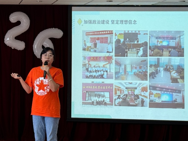 第25届研支团甘肃分队队长陈嘉琪代表甘肃队员姚茂、赵志昂、金晓君、洪宸、石雨佳、顾鹏远汇报了一年的支教服务工作。7名队员分别服务于玉门市油城学校,玉门市第二、第三小学,周平均课时量最高达22节。广西分队队长王晨读代表广西队员周家跃、王鼎一、王子越、汪倪诺、谢汶锦、徐艺洋、陈依婷汇报了全年的工作情况。8名队员分别服务于坡洪镇中心小学、田阳区初级中学、洞靖镇桥业中心小学、五村镇雷圩小学,周平均课时数16节。同时,支教团成员依托临时党支部,充分发挥党组织战斗堡垒作用和党员先锋模范作用。他们在理论中坚定理想信念、站稳人民立场,在实践中厚植家国情怀、练就过硬本领,以昂扬的青春斗志投身强国伟业。