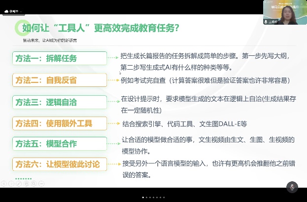 王华珍以《AIGC赋能思政工作技能实战分享》为主题,结合新时代高校辅导员育人本领的要求,紧密围绕辅导员在思政育人、行政管理及事务处理等方面的工作,运用大量的实战案例从生成式AI(AIGC)是什么、生成式AI(AIGC)“工具人”能力与应用模式、如何让“工具人”更高效完成教育任务及生成式AI“工具人”与人类的互动和协作四个层面进行了深入浅出的讲述,全方位详细地介绍了如何认识和提升辅导员数字化技能与素养。王华珍提出,数字化素养及能力不仅是未来时代科技教育的必需品,同时也是每个教育从业者提高自身综合竞争力的关键点。辅导员也应不断学习提升自身数字化水平来应对新的挑战和机遇,夯实自己的左膀右臂,让工作提效增速、更上一层楼。